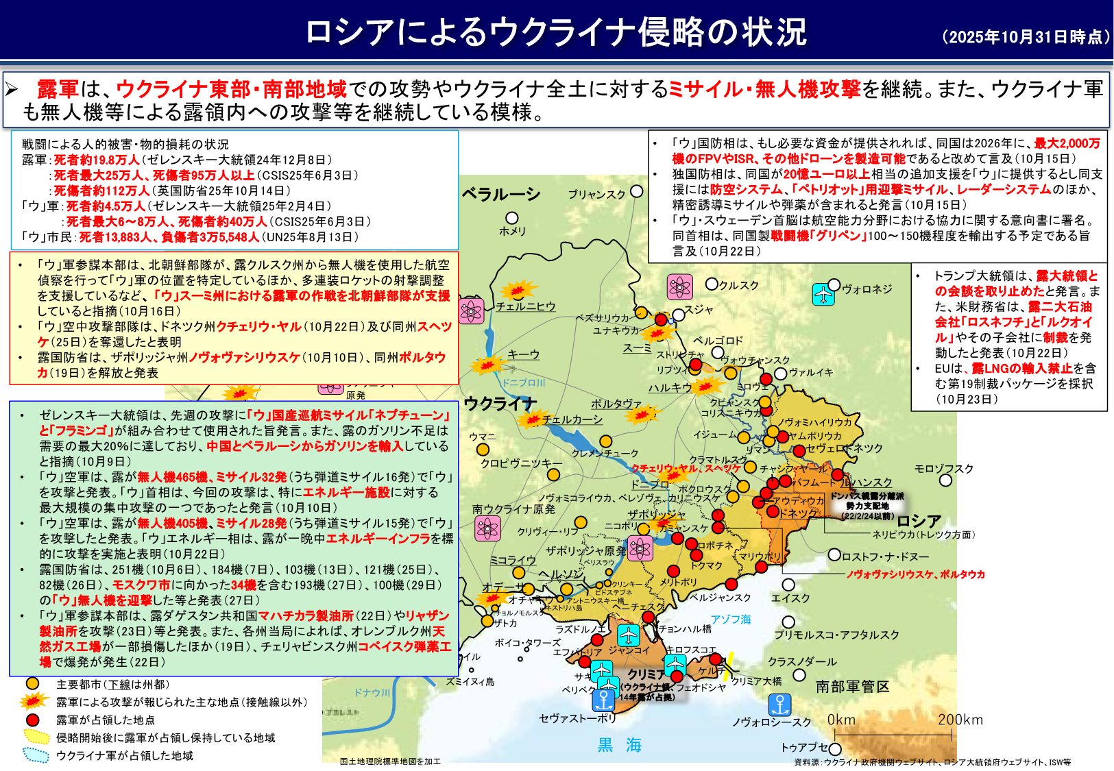 ▽ウクライナ空軍、ロシア軍が10月31日夜から翌日未明にかけてドローン223機を発射し、そのうち206機を撃墜したと発表。