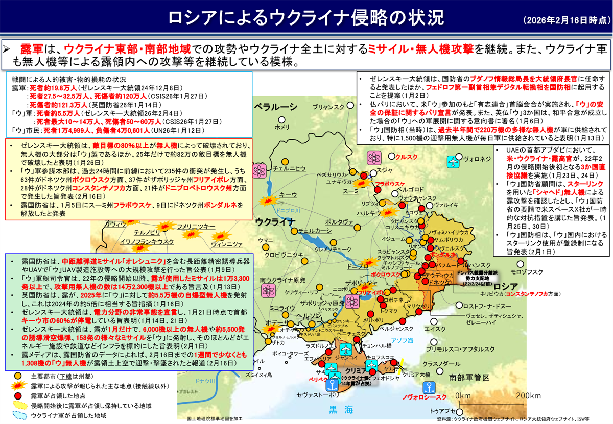▽ロシア大統領府、2月17~18日にスイス・ジュネーブで開催されるロシア・ウクライナ・米国による和平協議について、領土を巡る微妙な問題を含む「主要な問題」を協議すると発表。